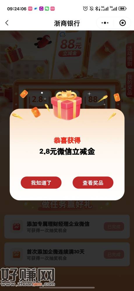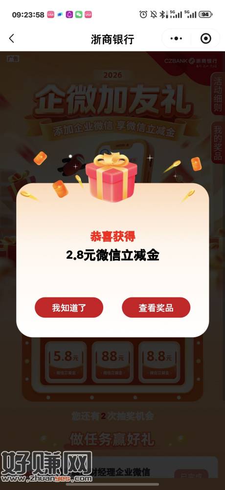 【浙商银行】送您企业微信加友礼,首次添加企微最高可获得2次抽奖机会,抽2.8-88元微信立减金,100%中奖。点击活动链接