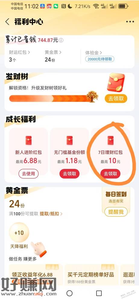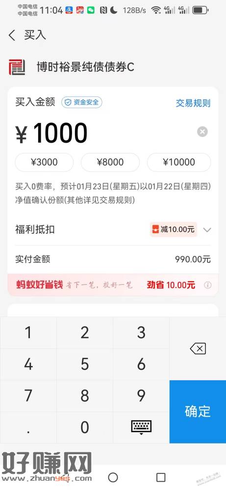 支付宝下面理财,点福利中心,看看有没有个10块钱的理财红包,可以买债基满1k抵扣