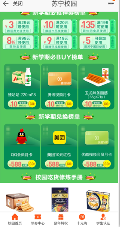 苏宁易购搜索苏宁校园,需要学生认证!中间鼠年特权,下拉可以看到