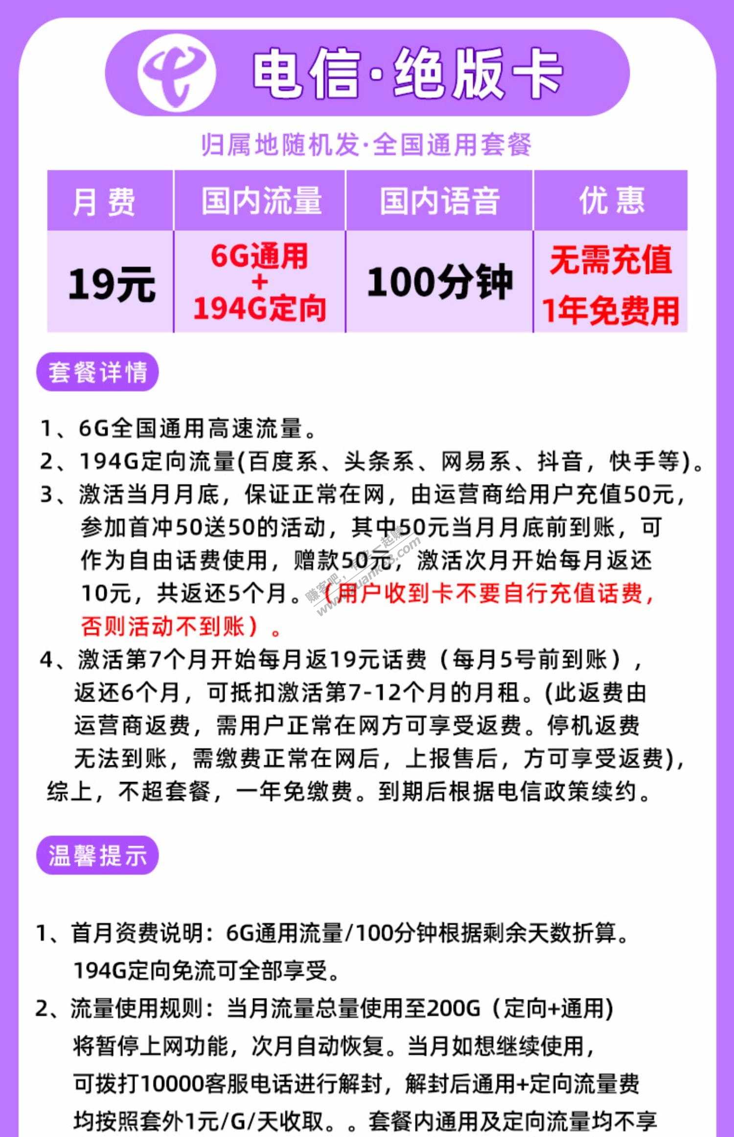 电信19一年(每月6G通用+194G定向+100分钟)流量套餐