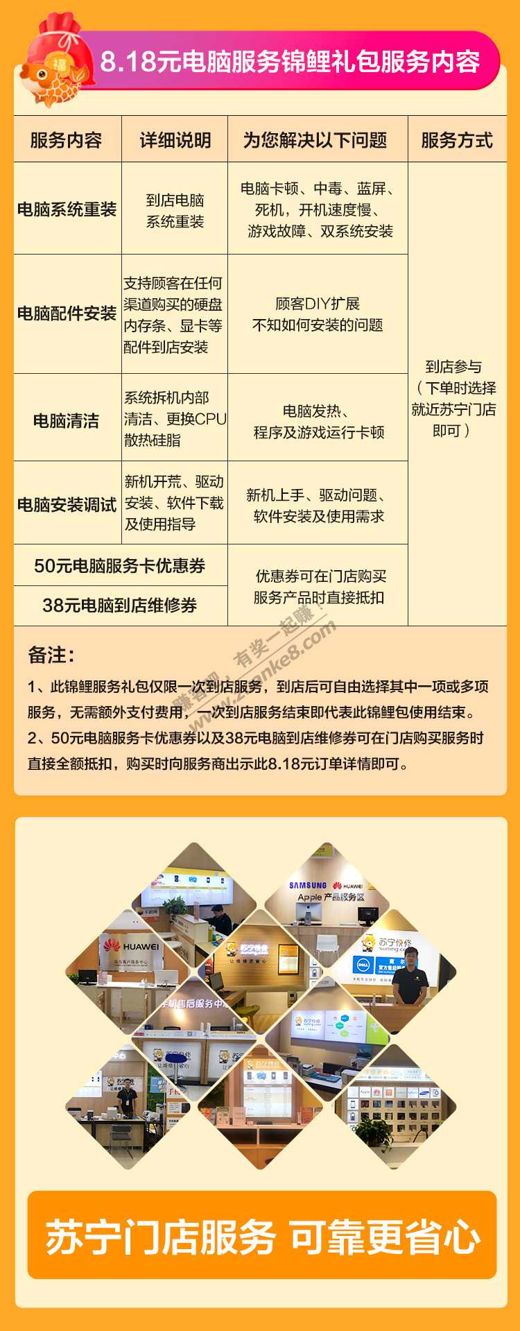 【30周年庆 818百亿补贴】8.18元电脑服务锦鲤包(1次到店服务,含5大服务:系统重装、配件安装、电脑清洁、安装调试,88元服务券)
