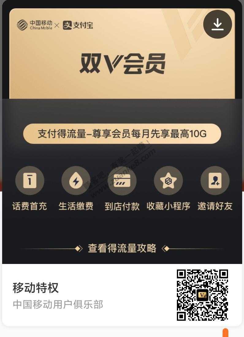 支付宝搜双V,开通会员一个月1.9块钱。点饿了么,充话费,生活缴费。每月首单得1g,线下也流量。二维码邀请性质,介意的别扫。