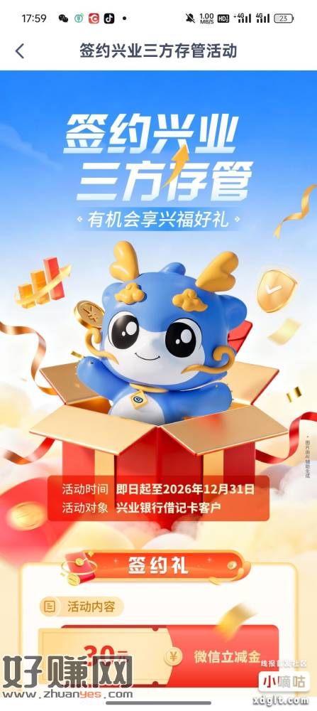兴业银行手机银行主页三方存管礼(限一类卡),开通证券绑定兴业银行卡,七个工作日内到账30立减金