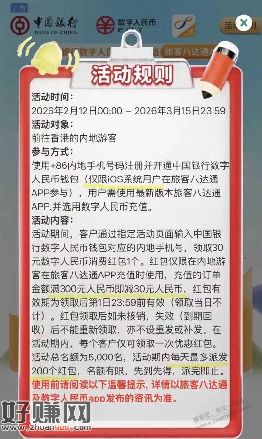 0点去领。旅客版八达通用中国银行数字人民币充值满300-30。