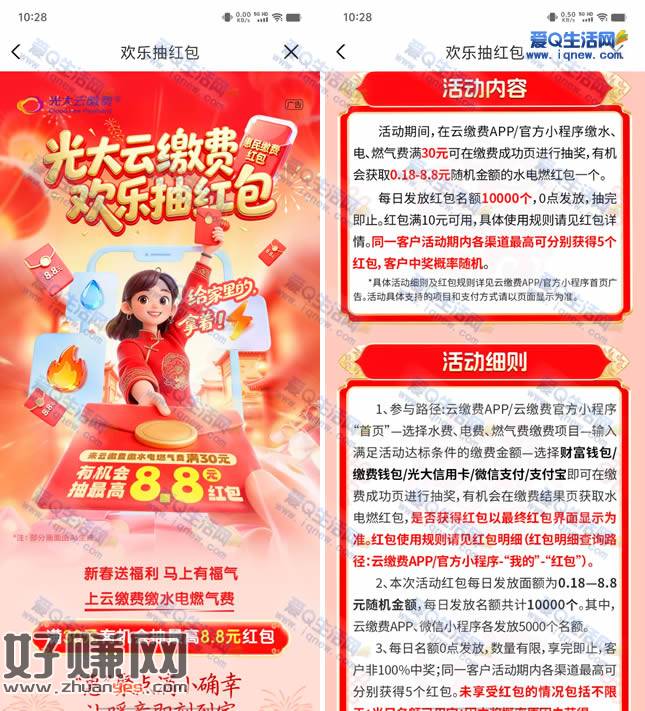 缴费水电燃,满30元可抽最高8.8元缴费红包,满10元可用