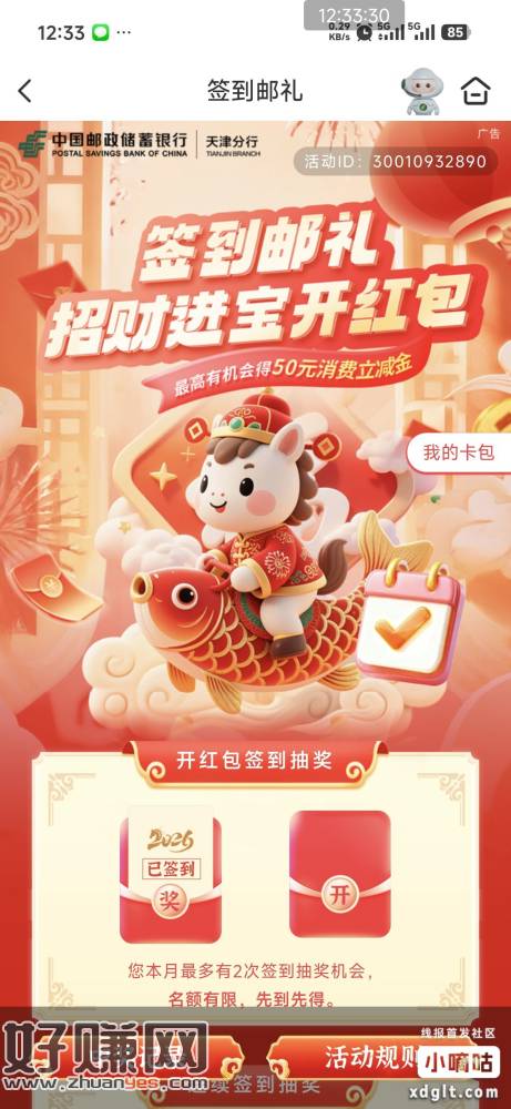 邮储天津分行活动专区 本地特色,一个月签到2次 一天一次开红包立减金