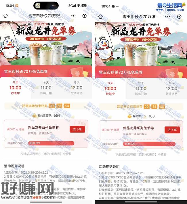 雪王新品龙井免单券 700雪王币兑换即可