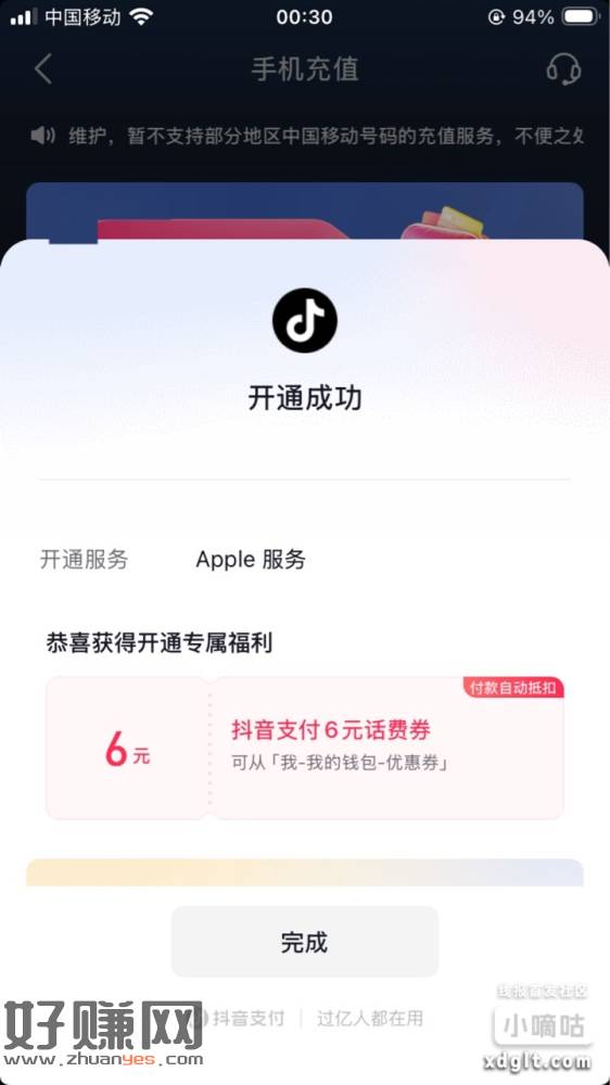 在iOS版抖音打开“我的钱包”中的手机充值页面,有概率领取6元无门槛话费,可多账号参与领取,用不完的话还能转卖。