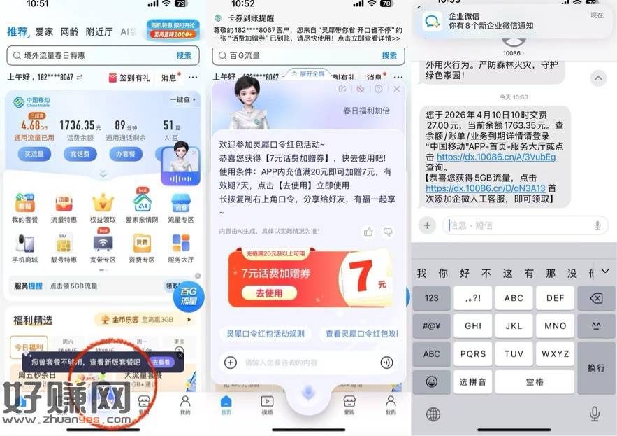 移动app给灵犀发送(春日福利加倍)领取话费卷20+7(我是