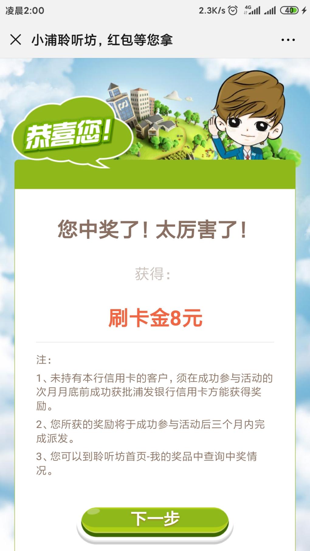 微信公众号:浦发银行xing/用卡 发消息 小浦聆听 答题抽奖,刚中了,我点的最上面中间那个,没做的试试!