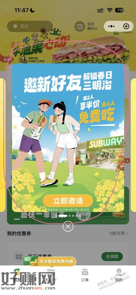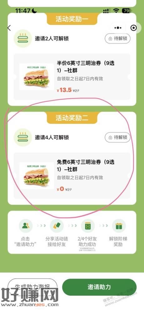 邀请4人可解锁 免费6英寸三明治券(9选1)
