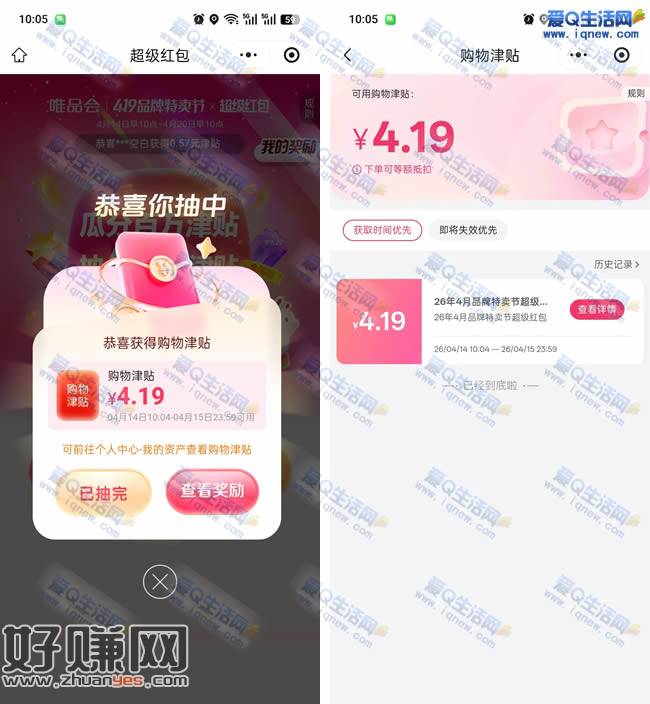 唯品会全周期抽4.19元购物津贴 亲测4.19元秒到