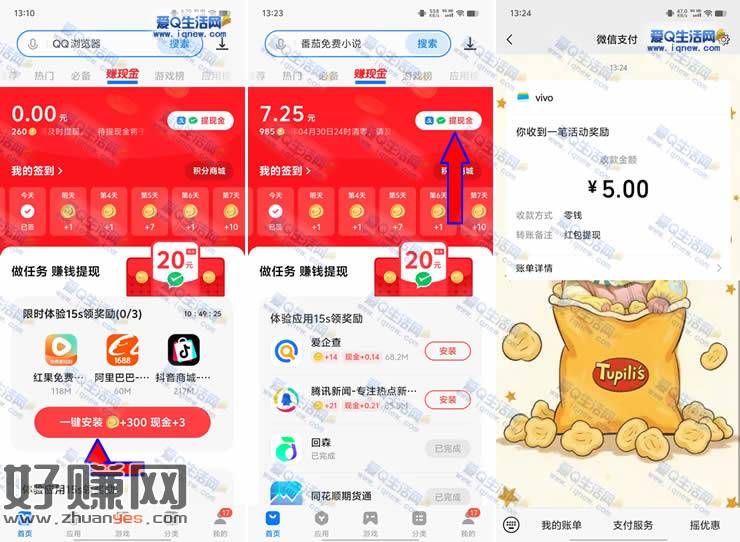 下拉还有很多下载浏览应用现金任务,凑够5元现金后,去顶部提现秒到微信