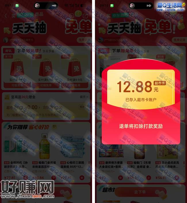 京东打开 领取免单机会 点击去下单满9.9以上就行 随机的最高可全部免单(少的可退)