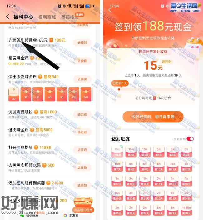番茄免费小说 连续签到30天188元现金