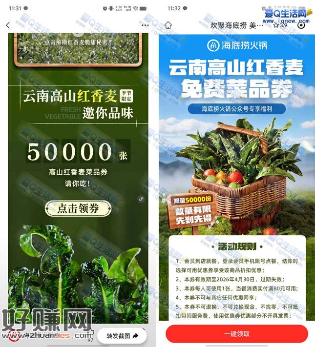 免费领海底捞高山红香麦菜品券 随单使用