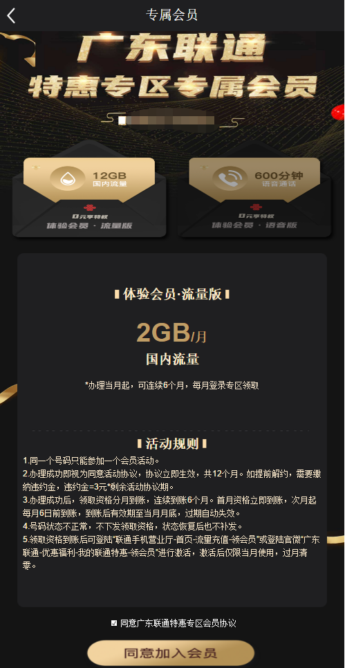 输入广东联通号码后在横幅广告找到0元享特权进入