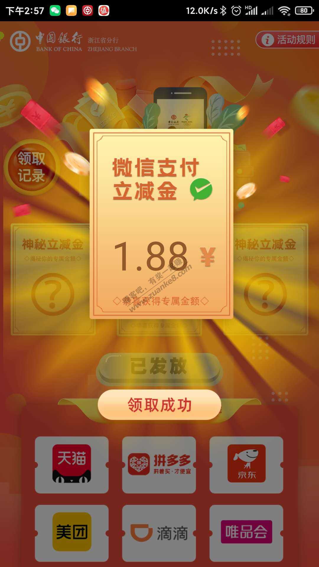 【浙江中行】本月底前,支付1分钱抽取微信立减金,每人每月限参与一次。入口:中行手机银行-生活-浙江省专属服务-福利金喜。回复TD退订