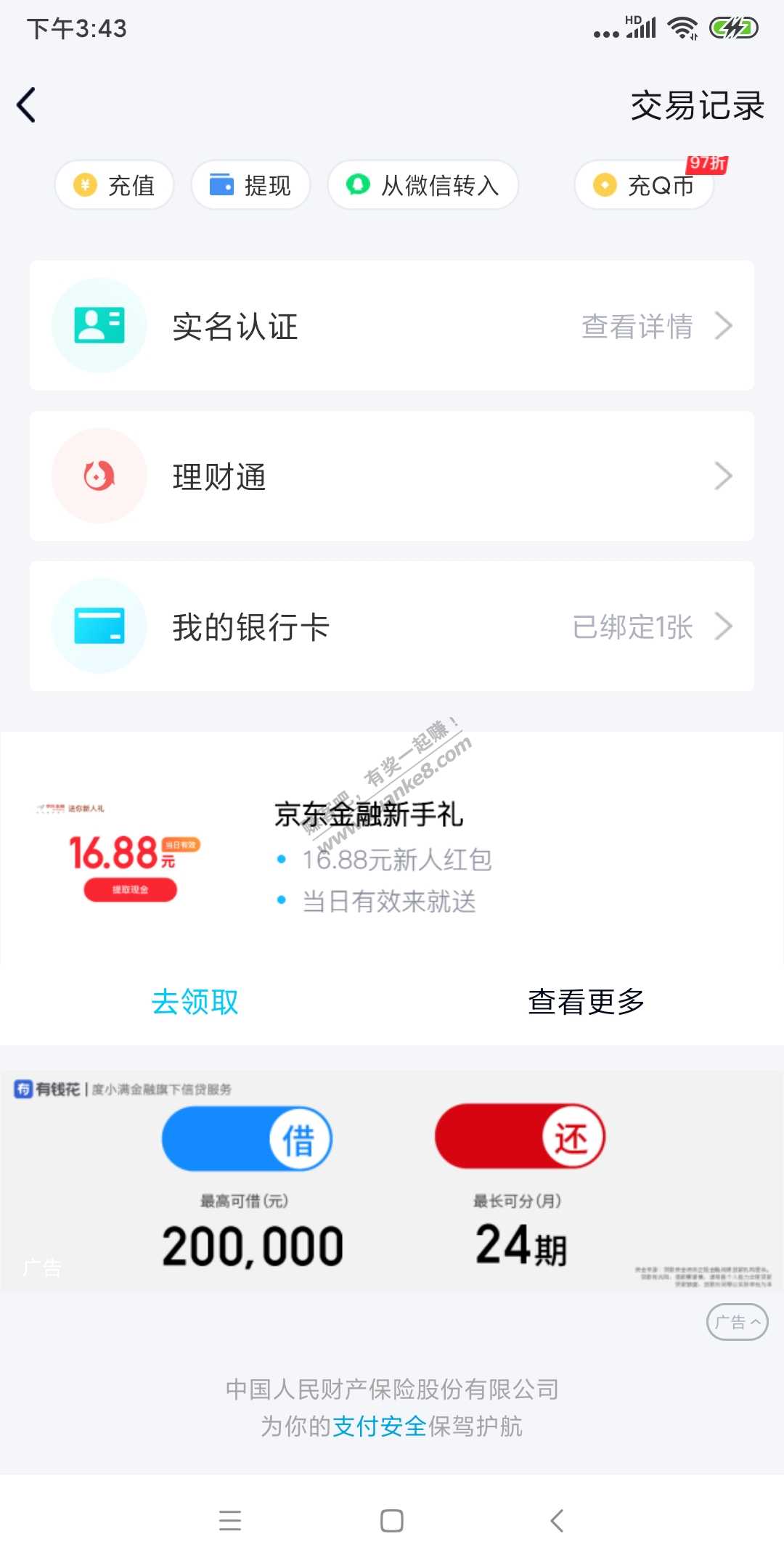 打开qq,我的钱包,钱包余额,下方领取京东金融新手礼。老用户也有红包