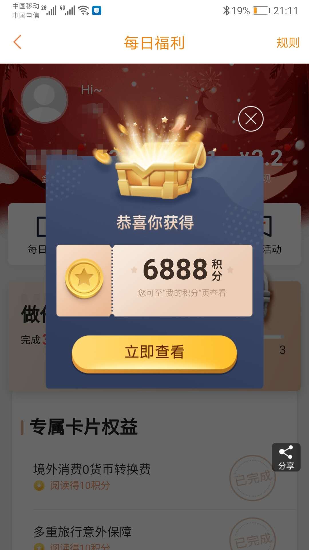 平安口袋APP-xing/用卡-每日福利-卡片权益,阅读完成任务,100%中奖,抽到6888积分