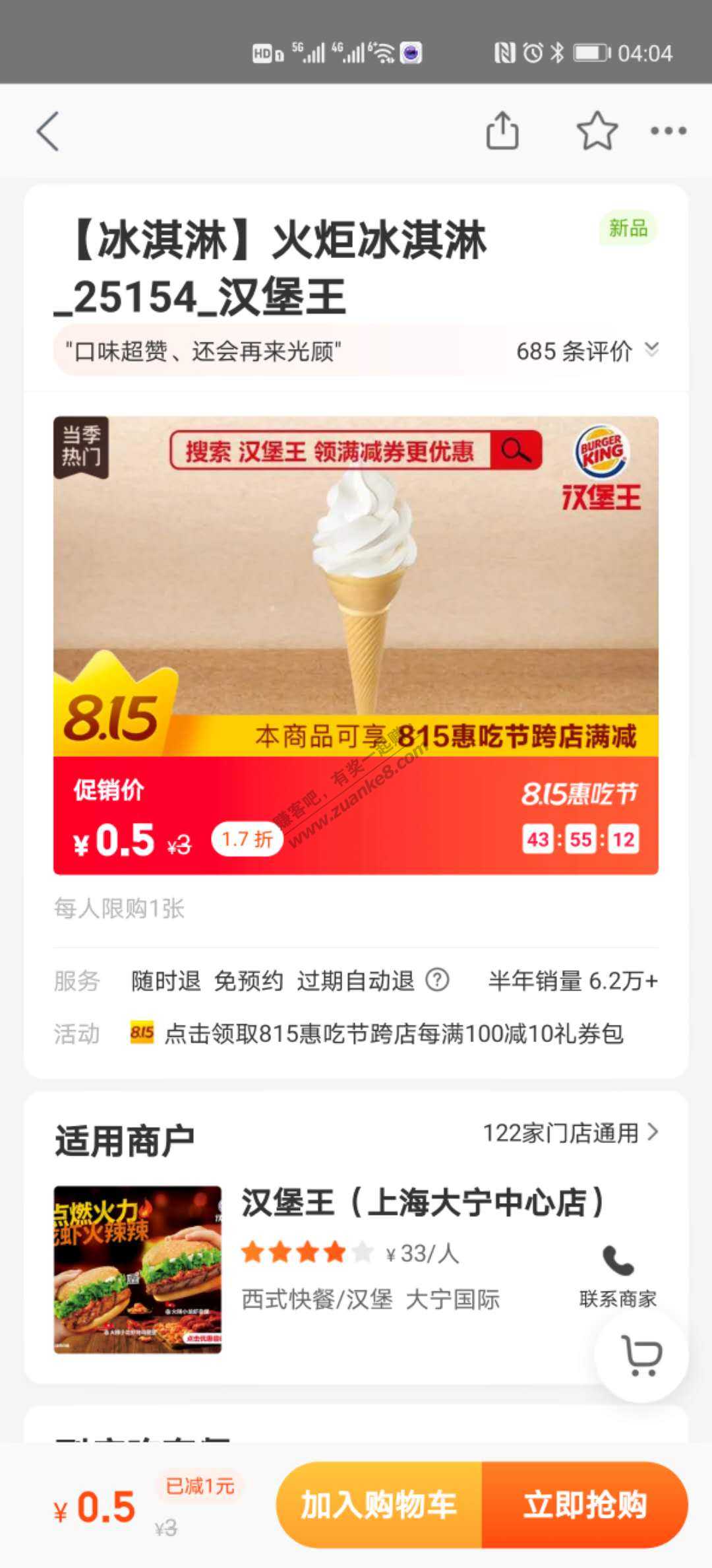 美团APP汉堡王甜筒0.5元一个