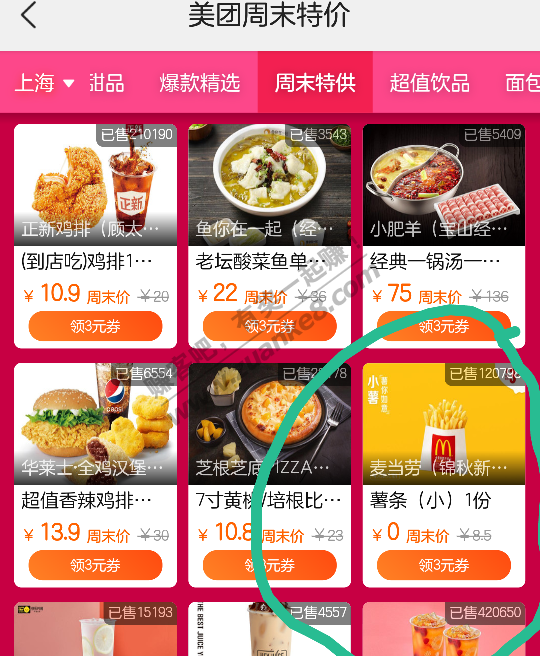 美团app扫第一个码,然后找周末特供,找到薯条