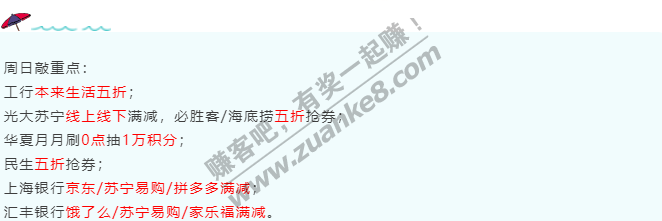 8月16号周日,银行活动汇总,光大苏宁线上线下满减,必胜客/海底捞五折抢券;
