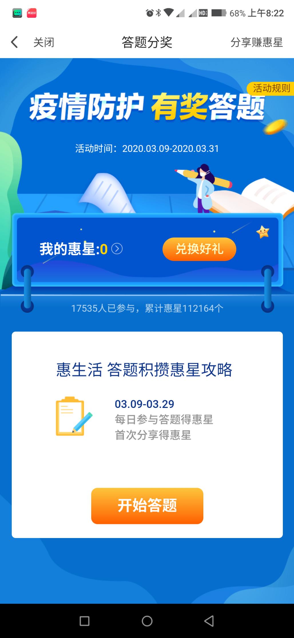 翼支付——惠生活——疫情防护有奖答题,奖励有3元生活券,其他都是鸡肋!24星很容易的!