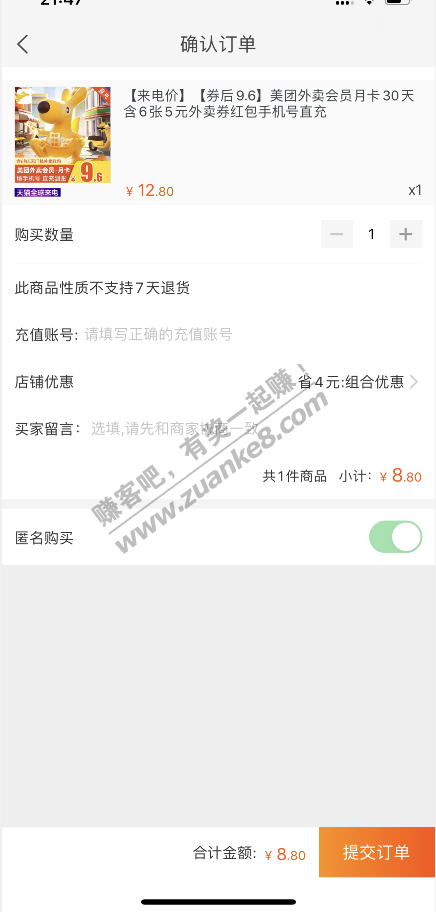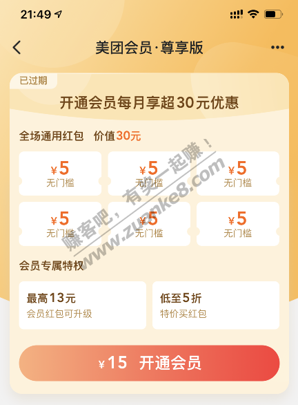 美团外卖30元红包(6张5元)原价15元/月撸客价8.8元/月,赚6.2元