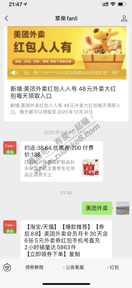 1、关注 草柴fanli 然后回复:美团外卖
