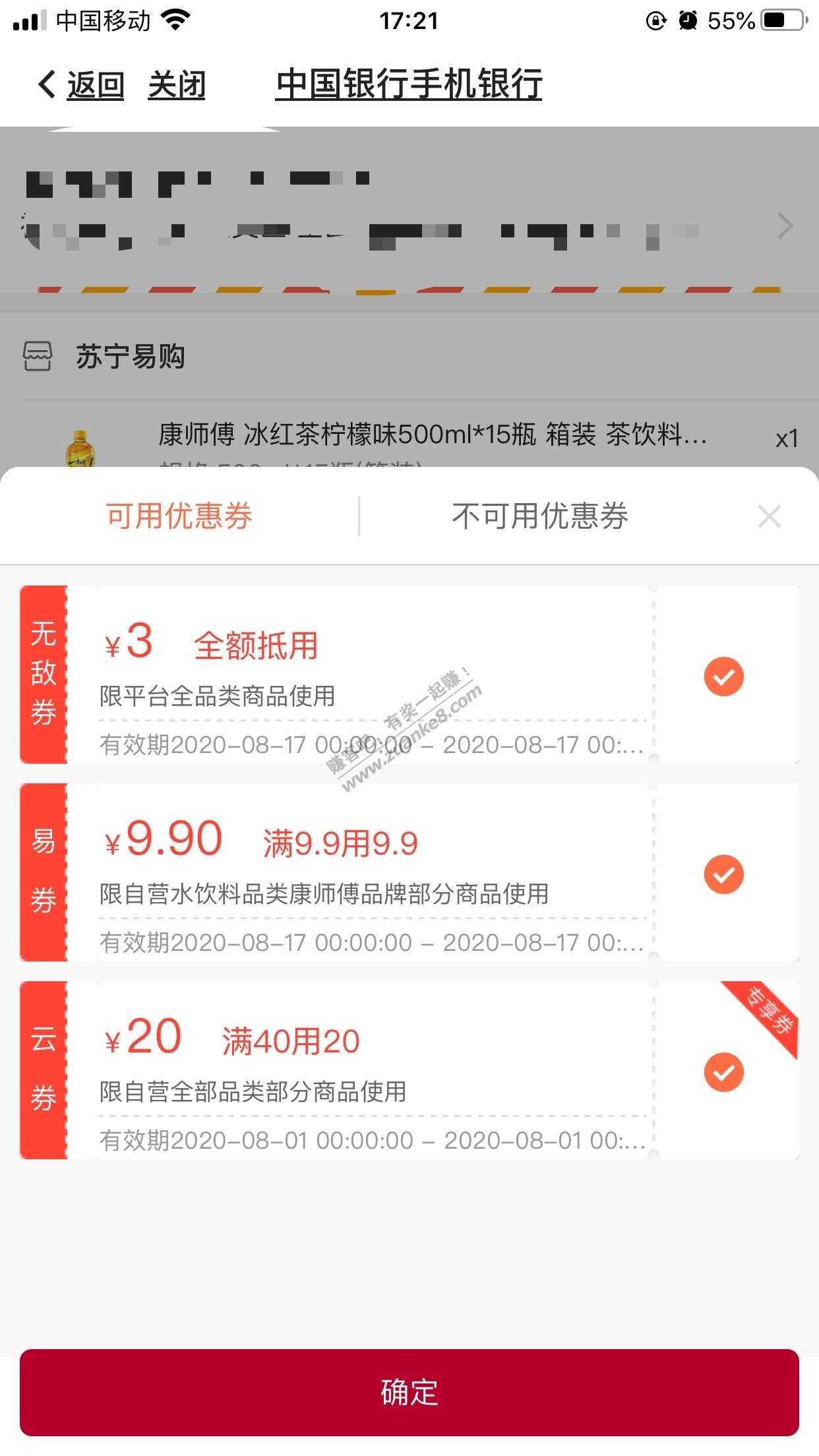苏宁有中行40-20券的,康师傅冰红茶好价