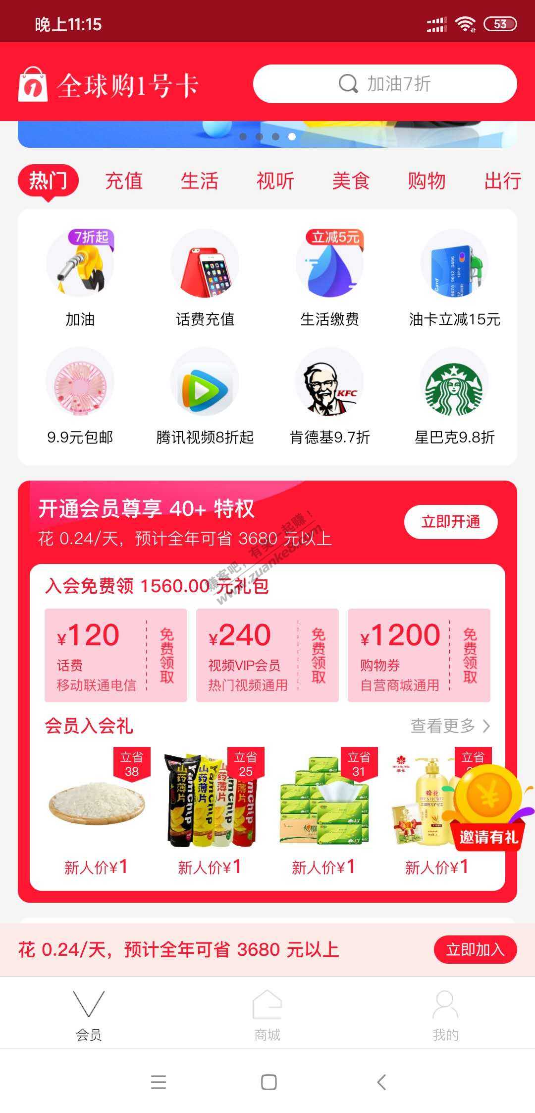 2、打开之后会在首页中间位置就能看到开通会员界面,季卡25元(送30元话费+爱奇艺、腾讯、芒果等热门视频会员3个月+部分购物券),年卡88元(送120元话费+爱奇艺、腾讯、芒果等热门视频会员12个月+部分购物券)
