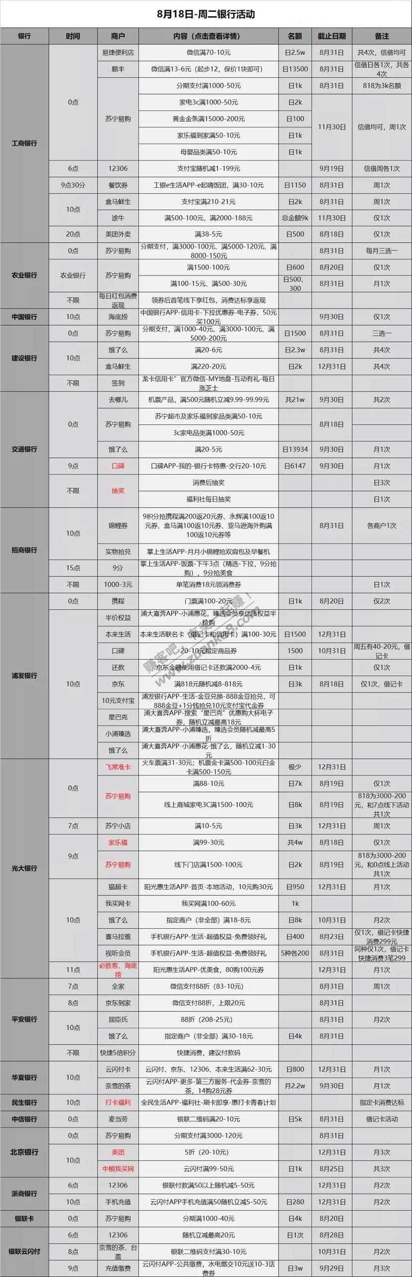 活动银行:建行、工行、光大、交行、招行、农行、邮储、广发、中行、中信、浦发、华夏、兴业、平安、宁波