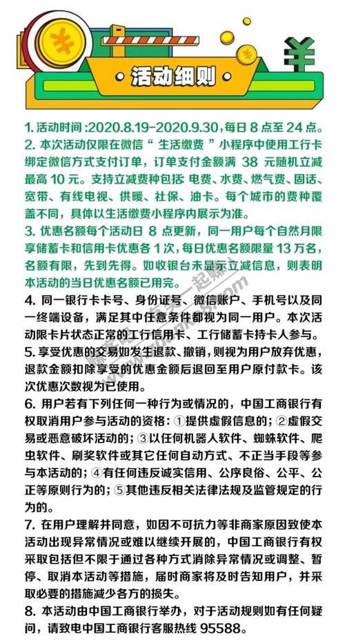 工行卡生活缴费满38元随机立减3-10元