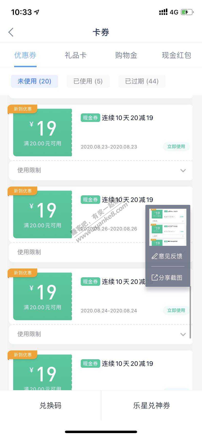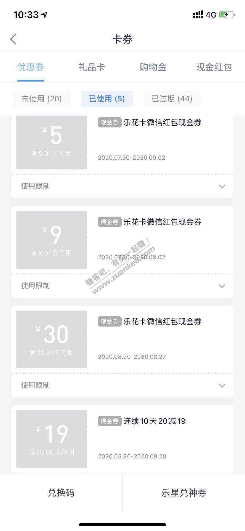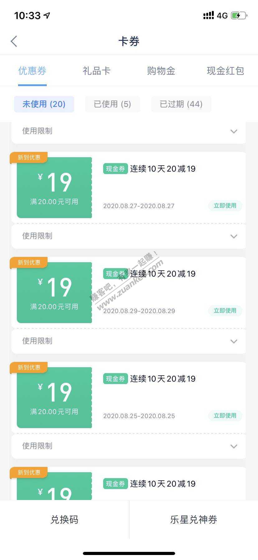 分期乐 新户不知道有没有 我是老户,不知道是不是都有20-19的,给了10张20-19的卷,一张30-30的卷,一张10-9的卷。2张5-5的卷 利润:190+30+20+10=260