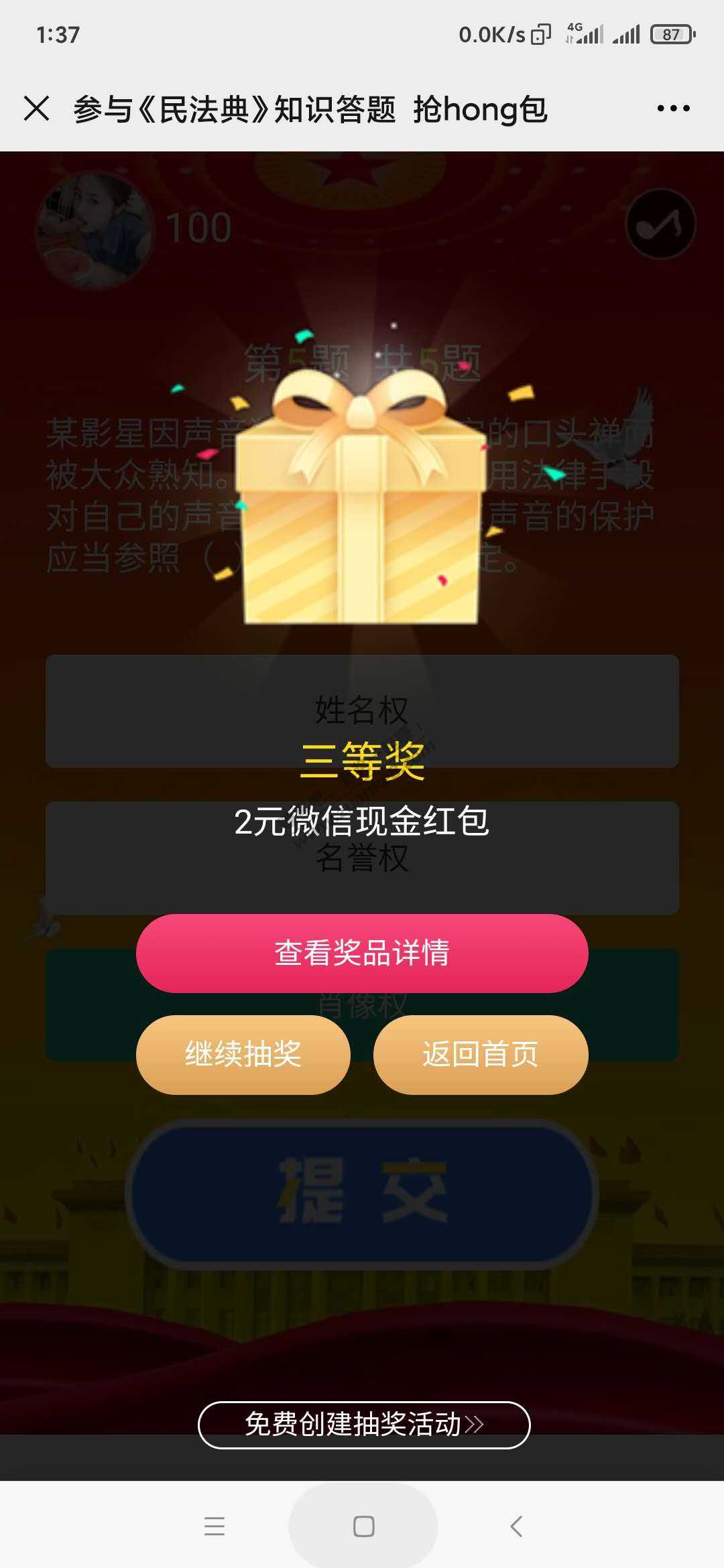 凡科答题 10-8中,对5抽,中了最低1元毛。