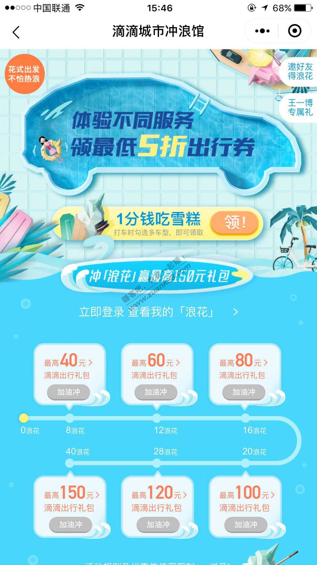 9滴滴出行公众号 一分钱可以吃雪糕 有兴趣的可以去试试那个冲浪馆 打车可以得浪花 可以有5折券