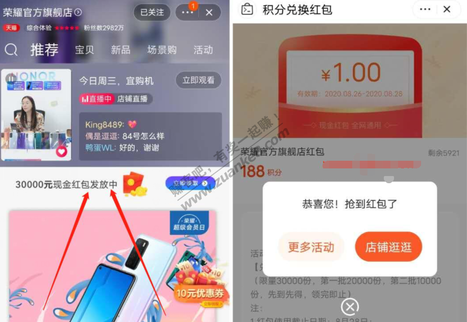 手机淘宝搜索荣耀官方旗舰店,进入店铺后点击箭头所示,入会使用188积分兑换1元淘宝红包