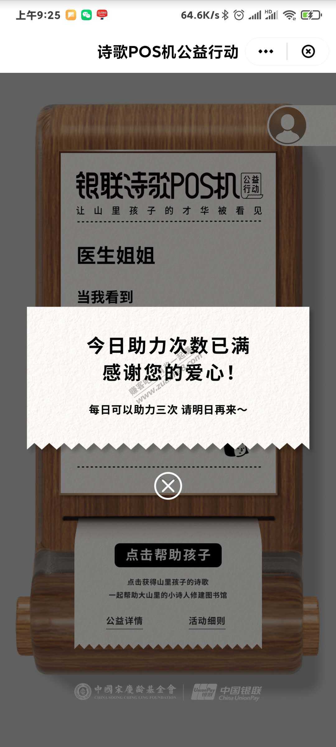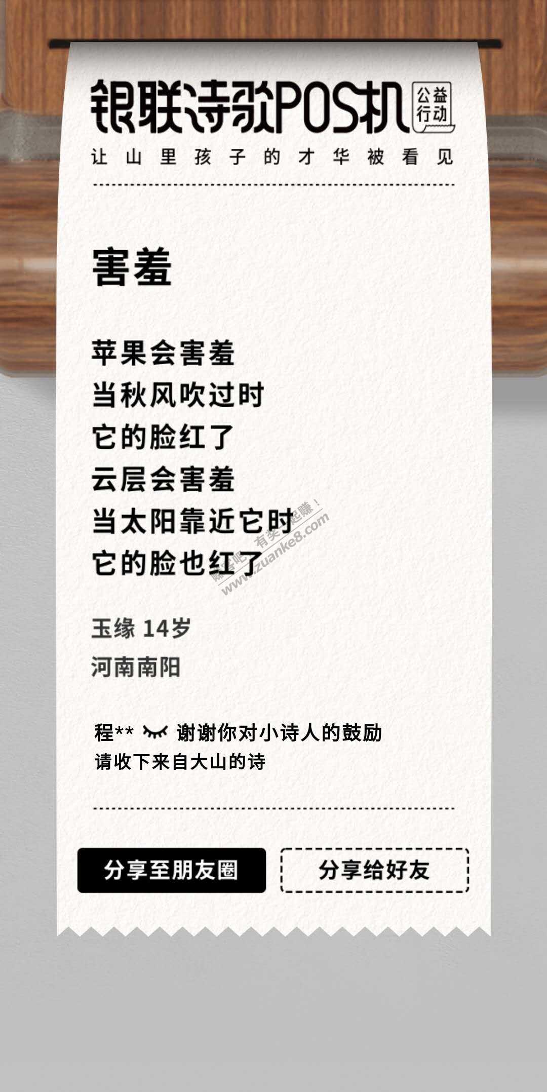 请大家去云闪付首页参加诗歌P~O~S机公益活动吧。