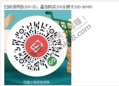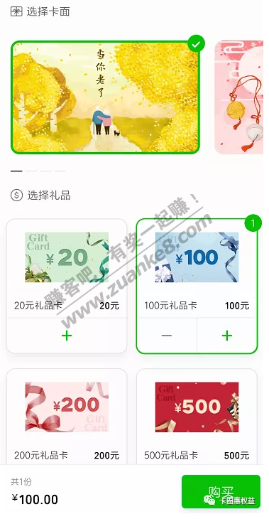 微信识别第二个码,进入购买流程,选择一张100的礼品卡进行付款,付款之前,能够看到满减界面。