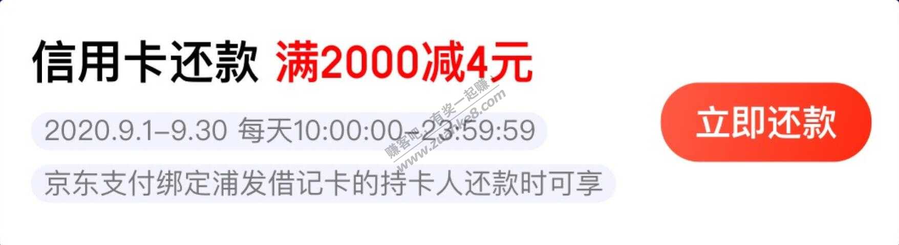 京东xing/用卡还款支付用浦发借记卡,xing/用卡还款满2000减4,九月份又有了,本月做过的请无视。。。