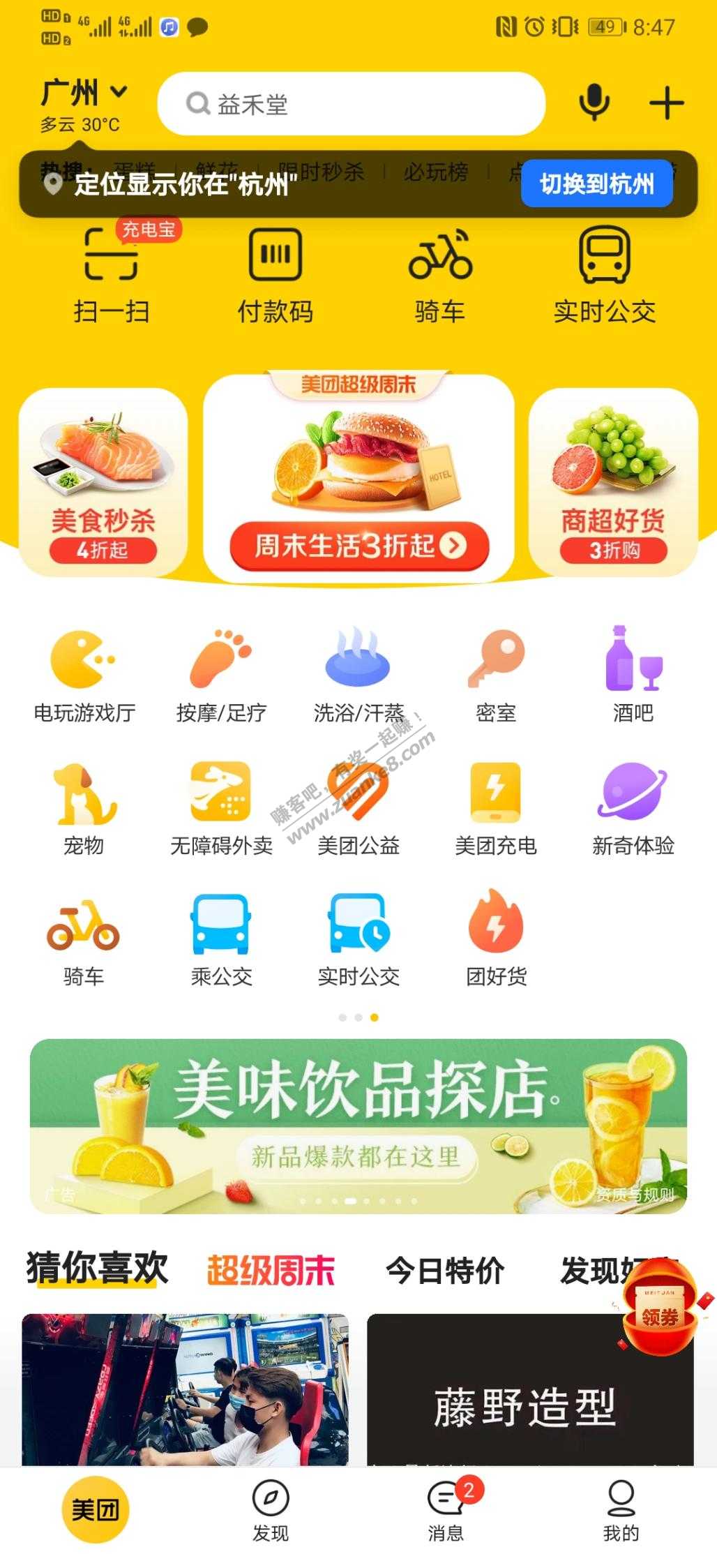 美团APP新手机号定位广州 开通单车周卡0.01元 会跳出来送一个月外卖会员 路径在首页中间滑到第三页 绑卡实名一下就好了 以前实名过别的账号也可以