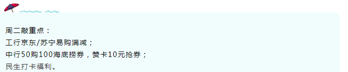 9月8日周二,银行活动汇总,敲重点:工行京东/苏宁易购满减,中行赞卡10元抢券等