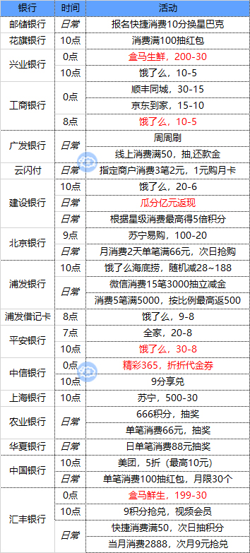 每笔消费达100元人民币及以上抽红包,每户每自然月最多30个红包。路径:官微——热卡——拆红包(3月31日截止)