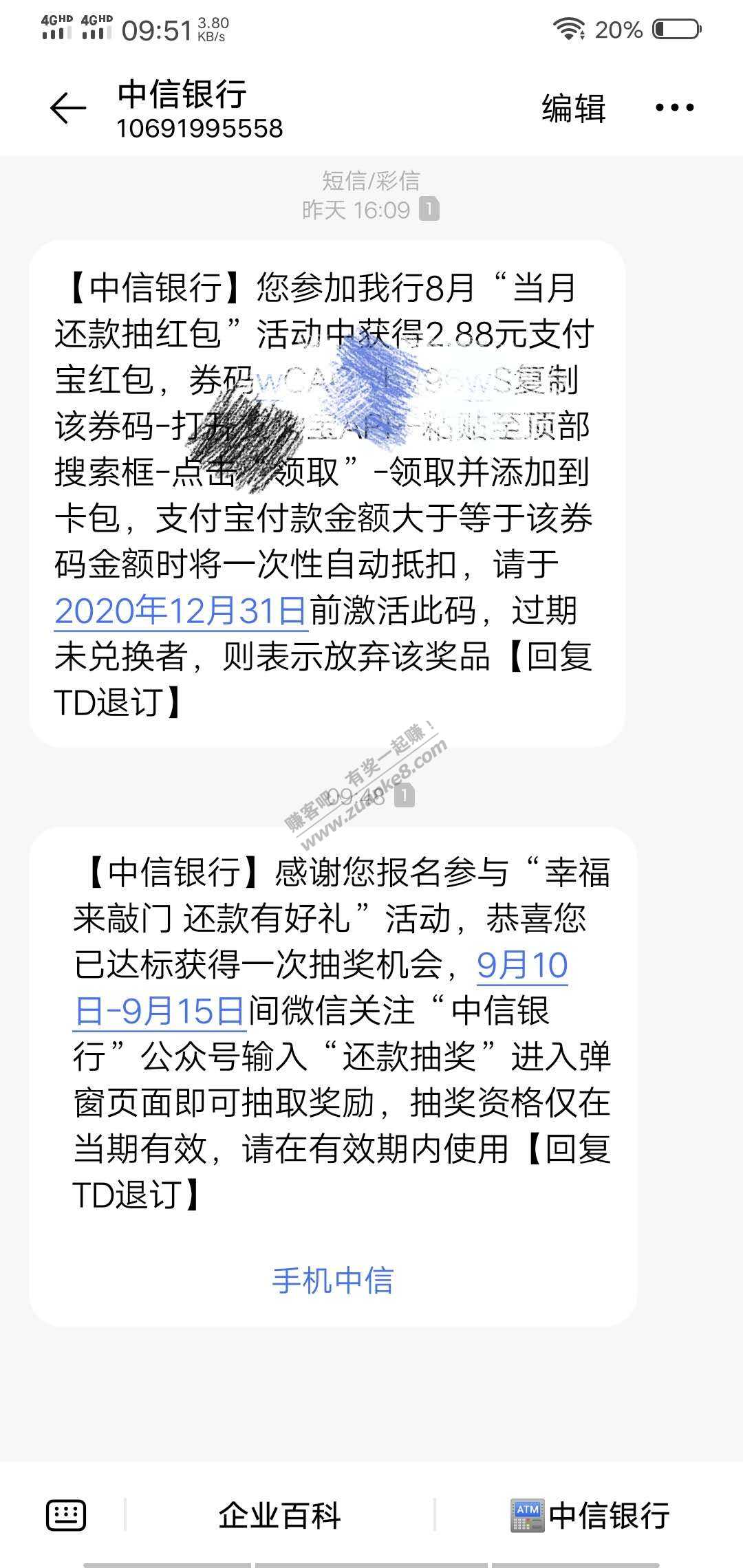 微信关注 中信银行, 输入 还款抽奖 10元话费