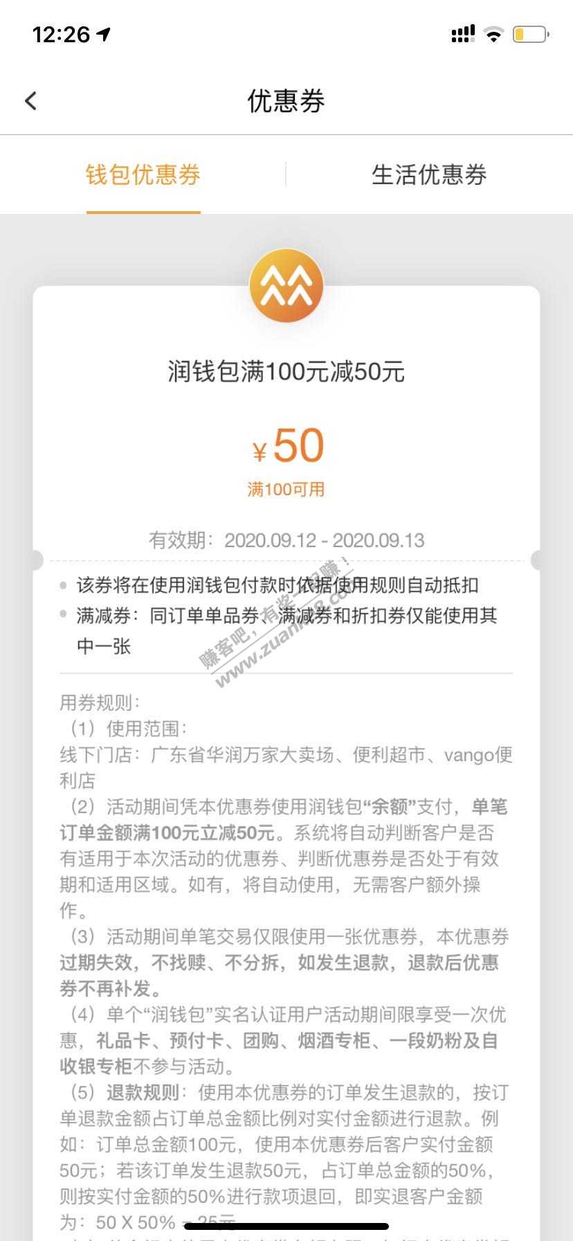 下载润钱包,注册开通余额支付后,会一自动送一张100-50的券