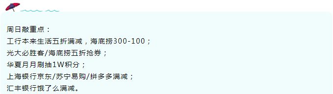 周日敲重点:工行本来生活五折满减,海底捞300-100;