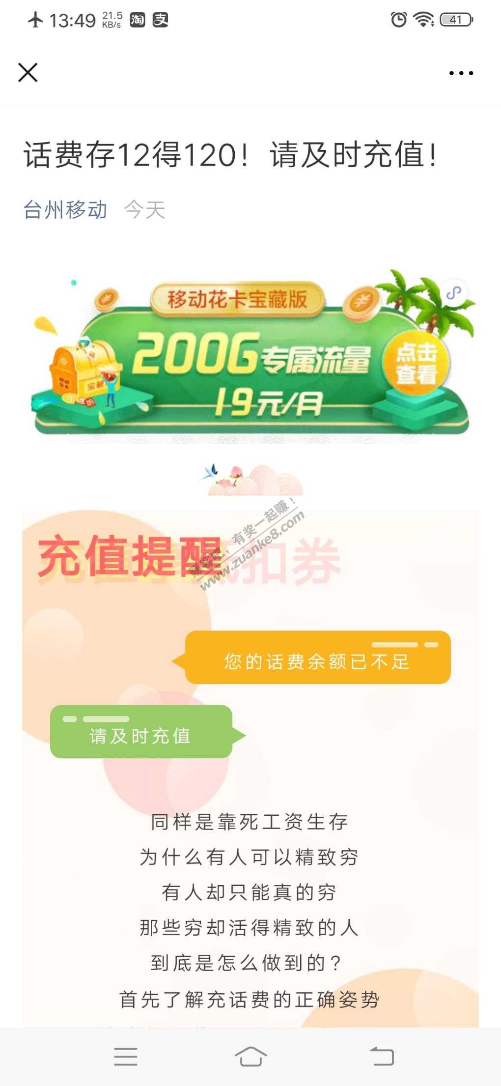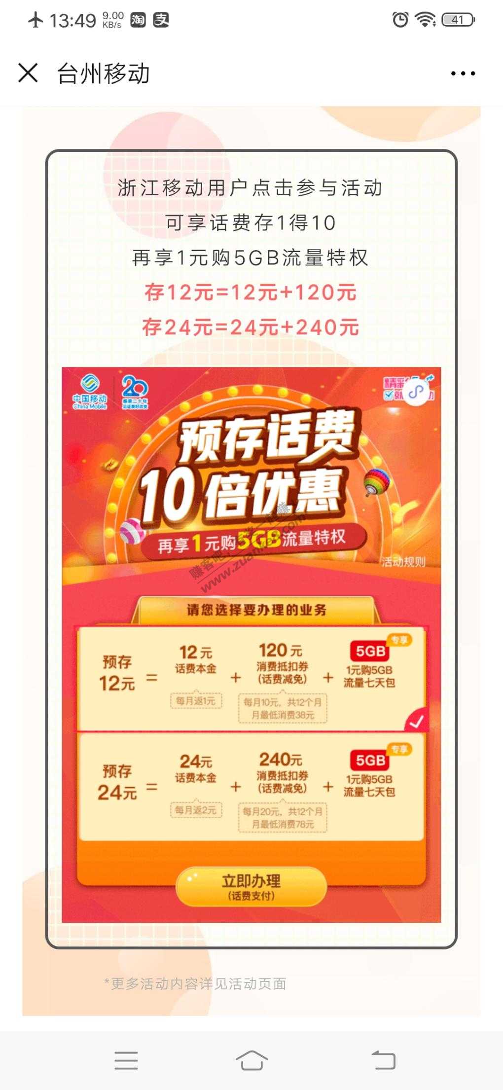 话费存12得120!请及时充值,公众号:台州移动具体请自测