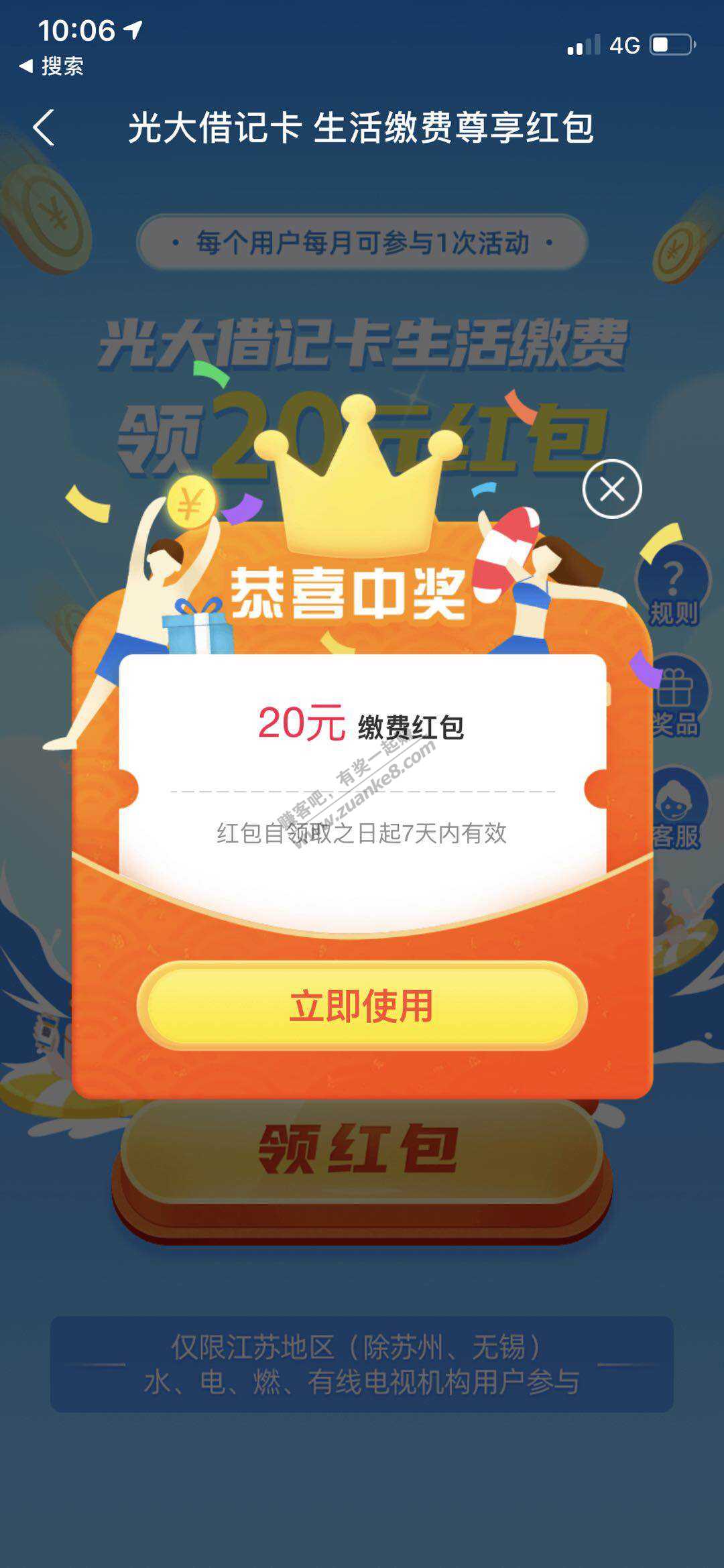 光大储蓄卡 限江苏(除苏州) 20生活红包