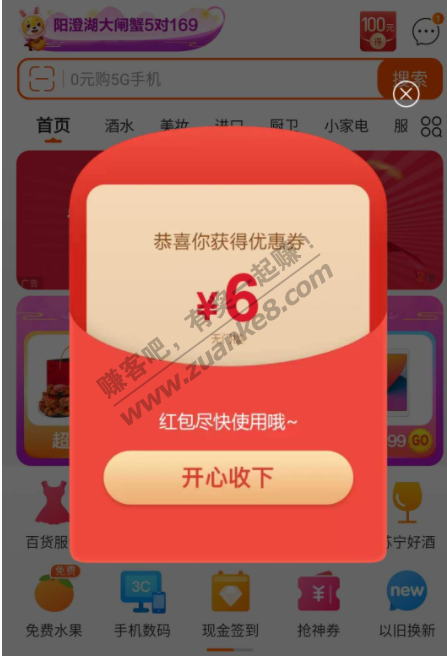 打开苏宁易购APP 会自动弹一个红包 拆开白号基本都是6块无敌券!!!!!!